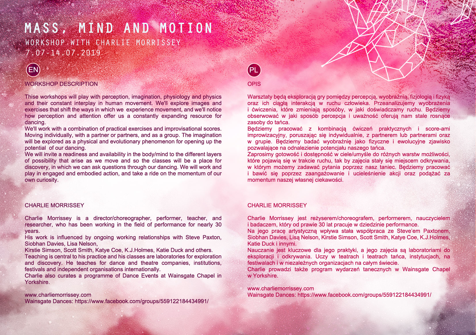 Intensywny warsztat z Charlie Morrissey jest częścią Festiwalu Tańca Kontakt Improwizacji Warsaw Flow 10 w Warszawie. Jest przeznaczony dla osób, które już tańczą lub dopiero rozpoczynają swoją przygodę z KI.