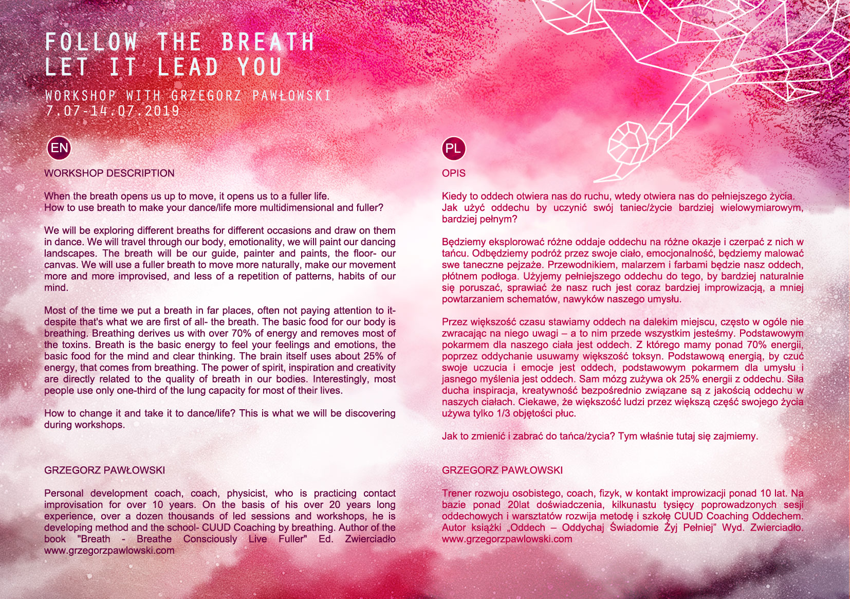 Intensywny warsztat z Grzegorzem Pawłowskim jest częścią Festiwalu Tańca Kontakt Improwizacji Warsaw FLOW 10 / re:mix. Jest przeznaczony dla osób, które już tańczą lub dopiero rozpoczynają swoją przygodę z KI.