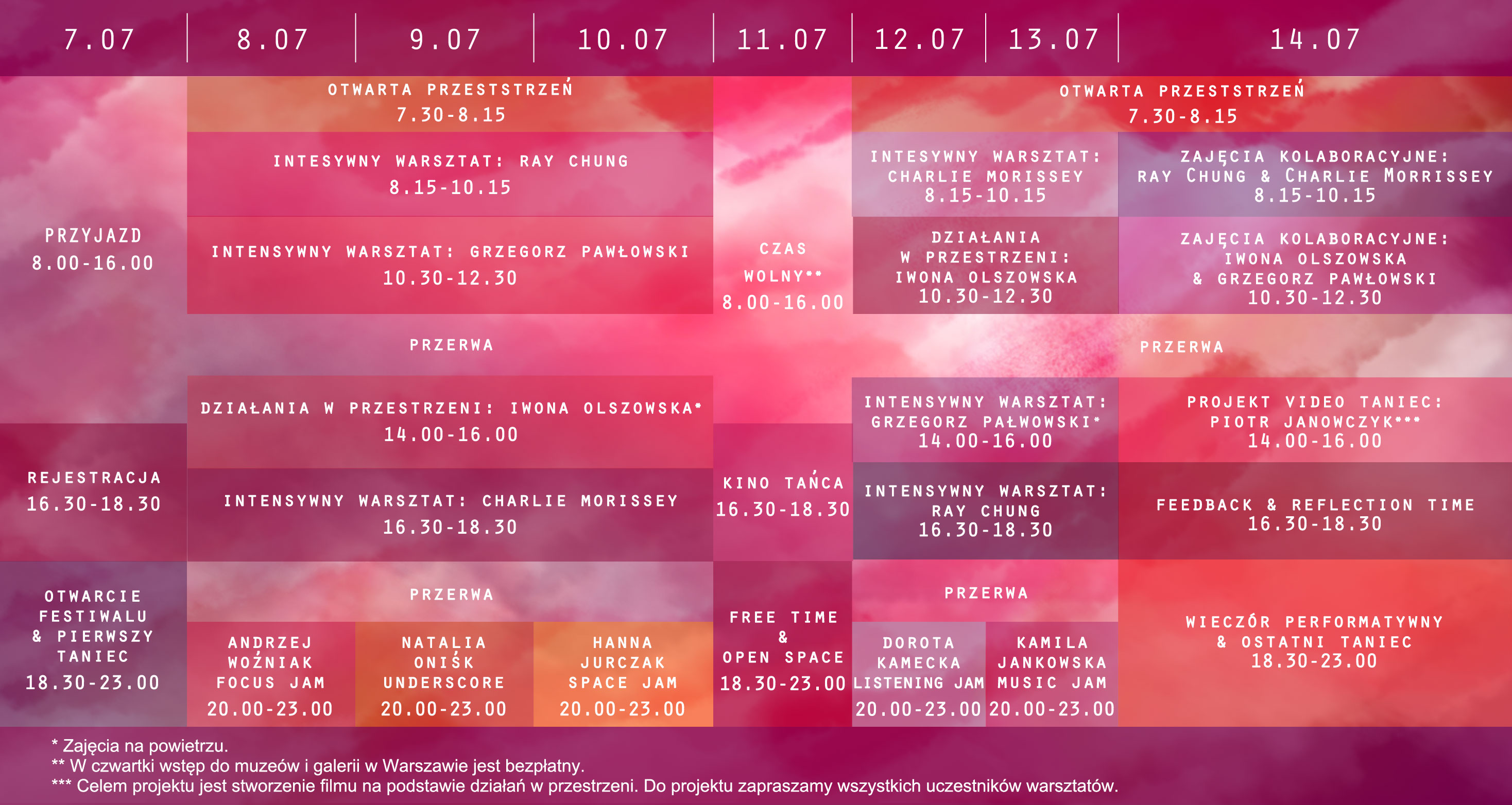 Wszystkie wydarzenia festiwalu oprócz warsztatu Site-Specific odbędą się w