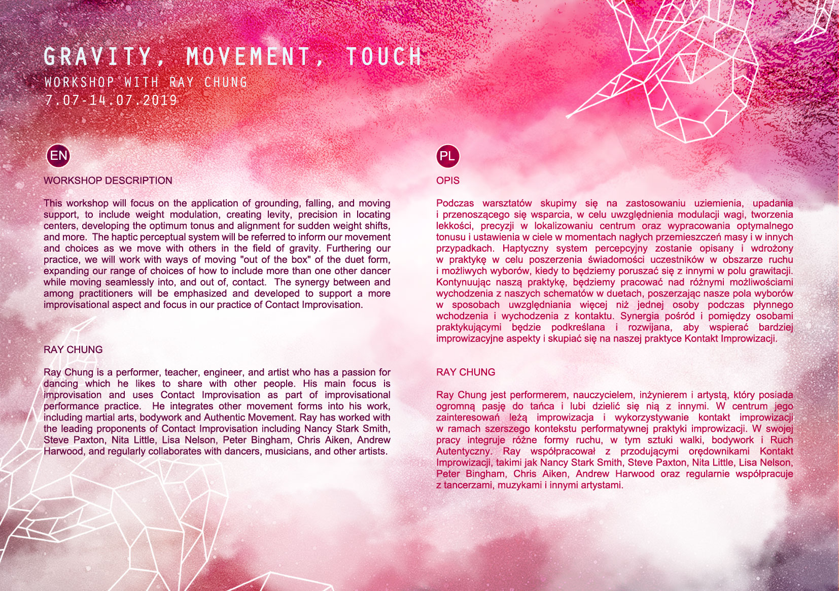 Intensywny warsztat z Ray Chung jest częścią Festiwalu Tańca Kontakt Improwizacji Warsaw FLOW 10 / re:mix. Jest przeznaczony dla osób, które już tańczą lub dopiero rozpoczynają swoją przygodę z KI.
